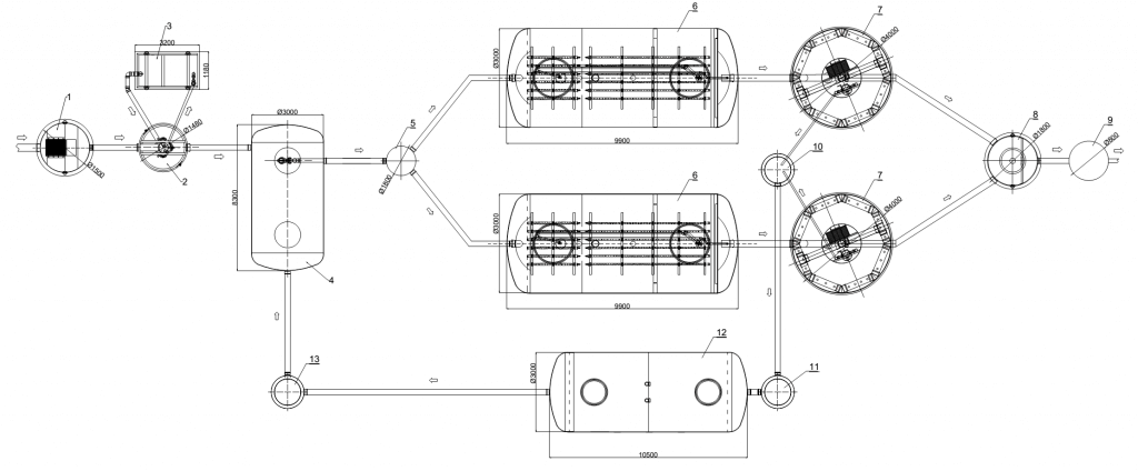 El lodo en esta cámara se mezcla utilizando un mezclador sumergible. En la siguiente etapa, el lodo se transfiere a la cámara de nitrificación (aeróbica). Aquí, los compuestos nitrogenados se reducen a nitrógeno amónico (N-NH+4). El aire se suministra a la cámara de aireación mediante un soplador de aire a través de difusores de silicona. Desde la cámara aeróbica, la mezcla de lodos se transfiere al tanque de sedimentación secundario, donde se produce la sedimentación de lodos activados y la decantación de las aguas residuales tratadas.
